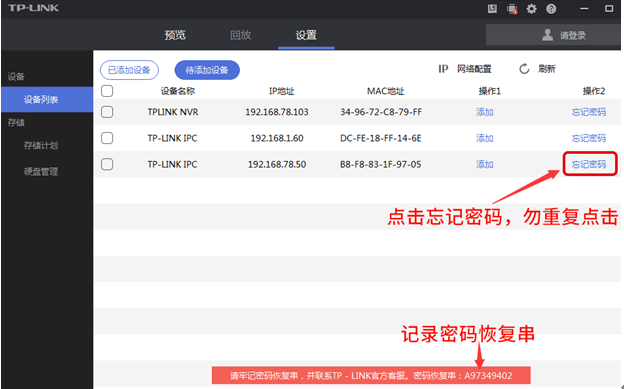 摄像头接电脑,电脑设置与摄像头同网段IP,打开“TP-LINK安防系统”客户端,进入“设置>待添加设备”,点击摄像头后面的“忘记密码”,记录这个密码恢复串和与之对应的IP地址: