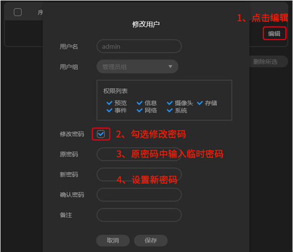 在“设置>系统>用户管理”中,对admin用户进行编辑,设置新密码: