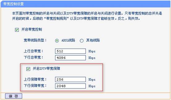 我司共享上网一体机TD-89402 V3、TD-W89741N V1/V3支持IPTV带宽保障功能,在IP带宽控制页面选择IPTV带宽保障并根据实际情况设置正确的上下行保障值。
